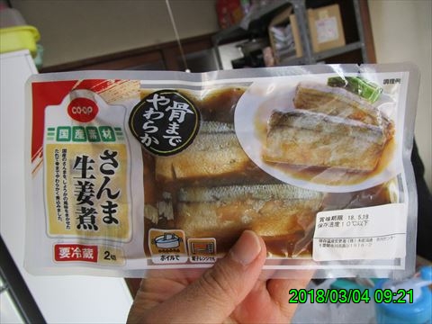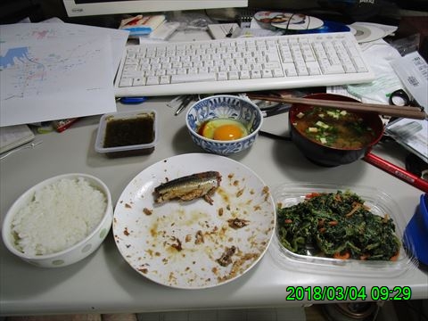 2018-03-04 今日の朝飯 メシ さんま生姜煮。 宮崎県産ほうれんそう胡麻和え。 もずく さんま生姜煮(爆発済み) たまご 宮崎県産ほうれんそう胡麻和え インスタント味噌汁 昨日間違えて一食多くおかずを買ったので朝食で消費する。
