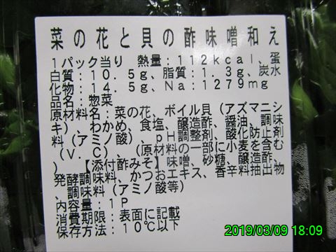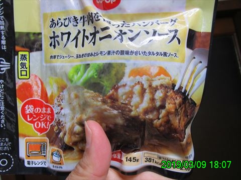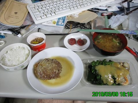 2019-03-09 今日の晩飯 メシ あらびき牛肉を使ったハンバーグホワイトオニオンソース。 脂質28.3g。これだけで一日の必要量をほぼ達成。どうなってる? 菜の花と貝の酢味噌和え。 -あらびき牛肉を使ったハンバーグホワイトオニオンソース -納豆 -菜の花と貝の酢味噌和え -うめぼし2個 -インスタント味噌汁